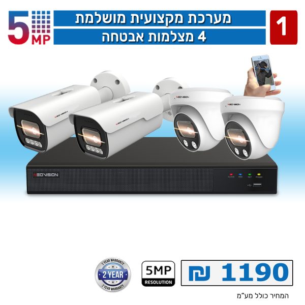 מערכת מקצועית 4 מצלמות אבטחה לבית ולעסק AHD 5MP